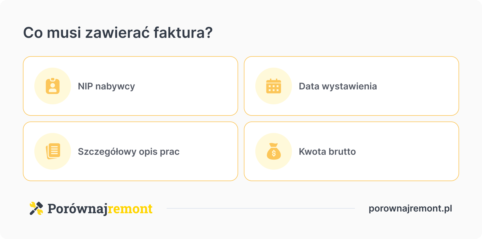 Prawidłowa faktura musi zawierać NIP podatnika jako nabywcy, szczegółowy opis wykonanych prac lub zakupionych materiałów oraz datę wystawienia z pełną kwotą brutto. Rachunki uproszczone są akceptowalne jedynie przy transakcjach nieprzekraczających 450 zł.
